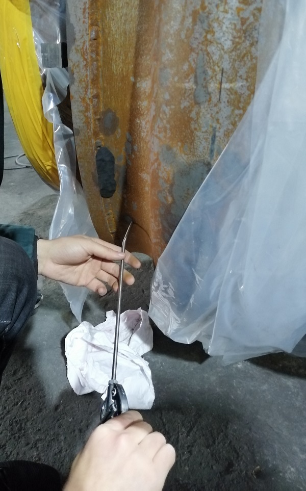 客戶現場的大腔體容器容積為2 m3,漏率要求為6.9*10-10Pa.m3/s。因為工件漏率要求很高,所以要求工件內部要抽得足夠幹淨,所以蜜桃久久久亚洲精品建議客戶配置分子泵組作為輔抽泵,同時配置真空計檢測腔體真空度。水蜜桃黄色网站連接在分子泵的排氣口和機械泵的進氣口之間。泵組與容器上焊接的KF40法蘭直接相連,先開機械泵對容器腔體抽真空,當真空度達到10Pa時開啟分子泵。經過大約一個半小時的抽空,容器腔體內真空度達到了0.5Pa,此時打開檢漏儀檢漏口的真空擋板閥,測得係統本底值為5.0*10-10Pa.m3/s,即可以進行噴氦檢漏。蜜桃久久久亚洲精品由近及遠,由上到下,在法蘭連接及焊縫處等可疑漏點噴吹少量氦氣,觀察檢漏儀的讀數是否上升,來查找漏點並進行封堵。待查完漏點後,再用薄膜將容器整體包裹住,向薄膜內充一定濃度的氦氣,可通過氦氣濃度儀來判斷充入氦氣的濃度。觀察檢漏儀穩定後的讀數,即可判斷工件整體漏率是否合格。