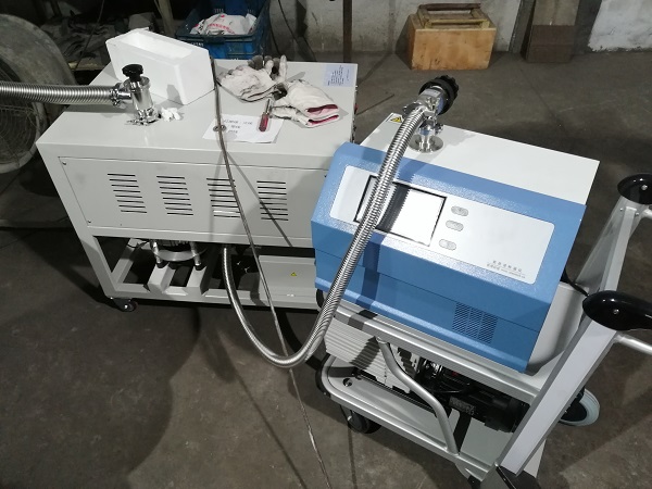 當容器的體積比較大,且需要進行真空檢漏時,就需要使用水蜜桃黄色网站搭配輔抽泵組一起來完成容器的內腔體泄漏檢測。具體實施過程是將輔抽泵組與被檢的容器連接後,通過泵組將腔體內部抽到一定的真空度,然後開啟檢漏儀,通過對容器表麵可疑泄漏處(通常是焊縫、法蘭連接等)噴吹氦氣,觀察檢漏儀的讀數,來尋找泄漏點。